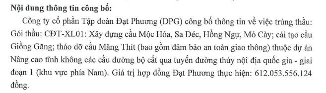 Vừa trúng gói thầu hơn 612 tỷ đồng, Tập đoàn Đạt Phương (DPG) rót 219 tỷ đồng thành lập công ty con