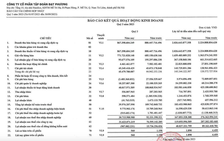 Về kết quả kinh doanh, theo báo cáo kinh doanh quý III/2023, Đạt Phương ghi nhận doanh thu thuần đạt 867,3 tỷ đồng, giảm nhẹ so với cùng kỳ năm ngoái.