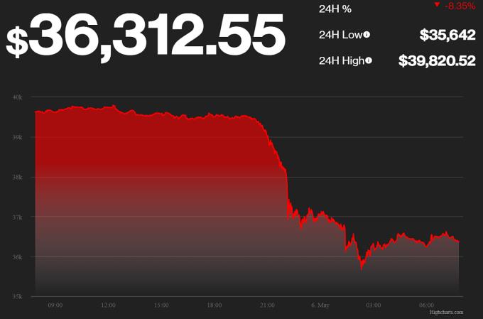 Theo dữ liệu từ CoinMarketCap, trong 24h qua, giá đồng Bitcoin đã giảm 8,22%, lùi về dưới mốc 36.000 USD. Mức sụt giảm này của Bitcoin đã co hẹp giá trị vốn hóa xuống còn 693 tỷ USD. Đáng chú ý, hôm 5/5, giá Bitcoin từng tăng vọt lên ngưỡng 40.000 USD.