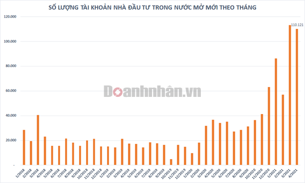 Lũy kế 4 tháng đầu năm, nhà đầu tư trong nước mở mới 366.816 tài khoản chứng khoán, bằng 93% lượng tài khoản mở mới trong cả năm 2020. Tính tới cuối tháng 4, tổng số tài khoản chứng khoán nhà đầu tư trong nước hiện đạt hơn 3,1 triệu, tương đương khoảng 3,1% dân số.