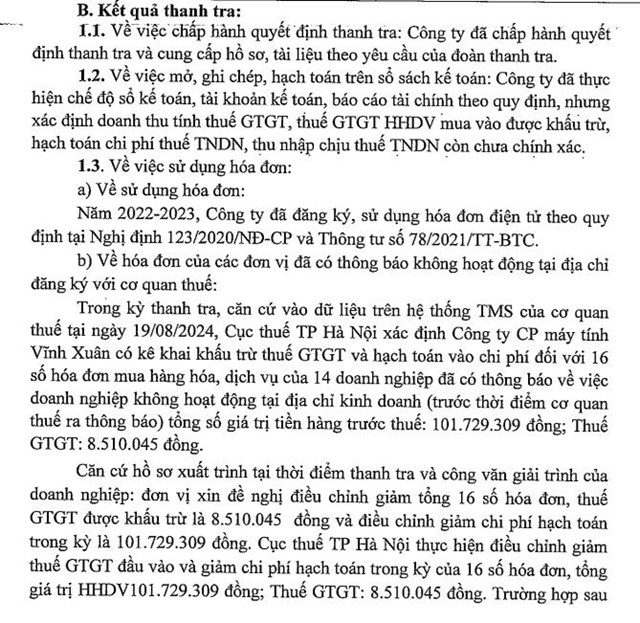 Cục Thuế TP. Hà Nội đã ban hành kết luận thanh tra thuế tại CTCP Máy tính Vĩnh Xuân, chỉ ra nhiều vi phạm của doanh nghiệp này trong lĩnh vực thuế với tổng số tiền thuế truy thu, tiền phạt vi phạm hành chính và tiền chậm nộp hơn 330 triệu đồng.