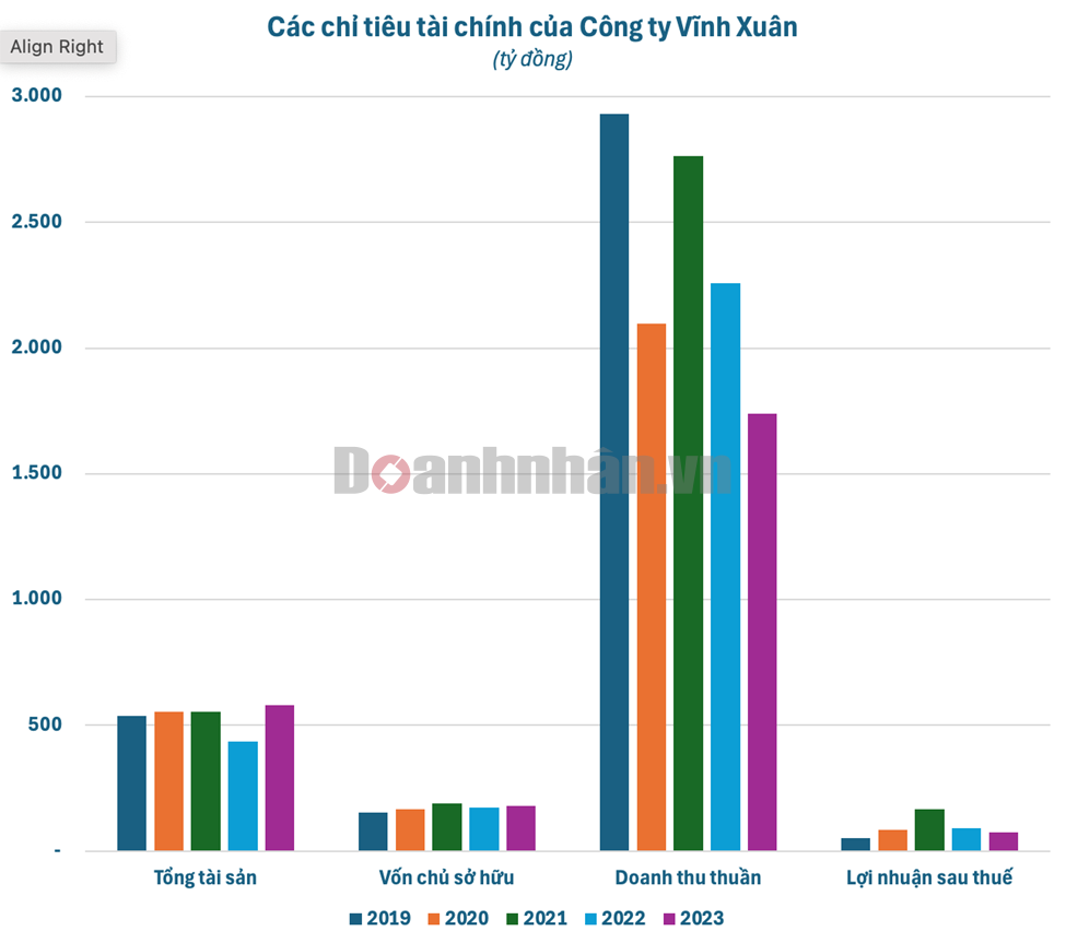 Lợi nhuận sau thuế của Vĩnh Xuân cũng đi lùi trong 2 năm gần nhất sau khi lập kỷ lục vào năm 2021. Từ mức 166 tỷ đồng năm 2021, lãi ròng của doanh nghiệp này đã giảm còn 74 tỷ đồng trong năm 2023. Đây là mức lợi nhuận thấp nhất trong vòng 4 năm trở lại đây của Vĩnh Xuân. Tổng thuế TNDN đã nộp trong 5 năm qua vào khoảng 116 tỷ trong khi tổng doanh thu lên đến gần 12.000 tỷ.