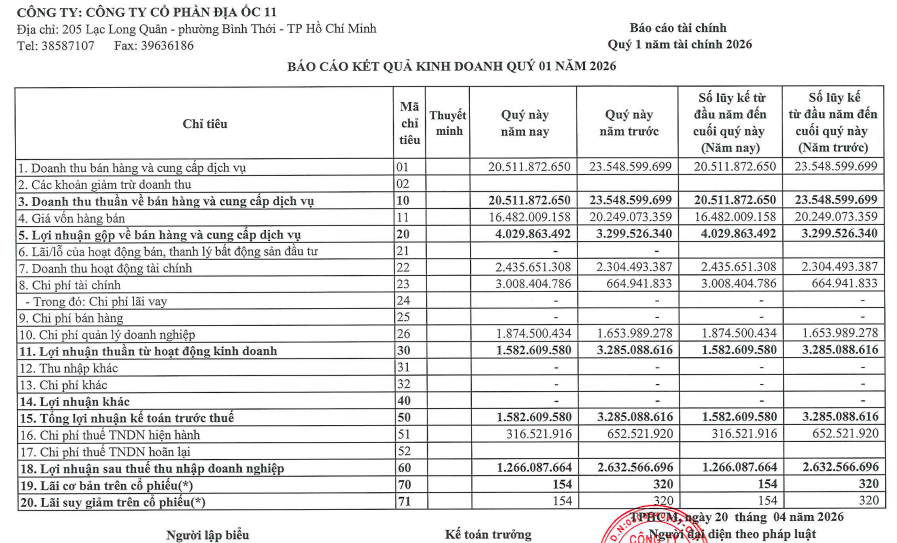 Về bức tranh tài chính, theo báo cáo kinh doanh quý I/2026, doanh nghiệp ghi nhận doanh thu thuần đạt 20,5 tỷ đồng, giảm khoảng 3 tỷ đồng so với cùng kỳ năm ngoái. Giá vốn giảm từ 20,2 tỷ đồng về 16,4 tỷ đồng, lợi nhuận gộp tăng hơn 800 triệu đồng lên mức 4 tỷ đồng.