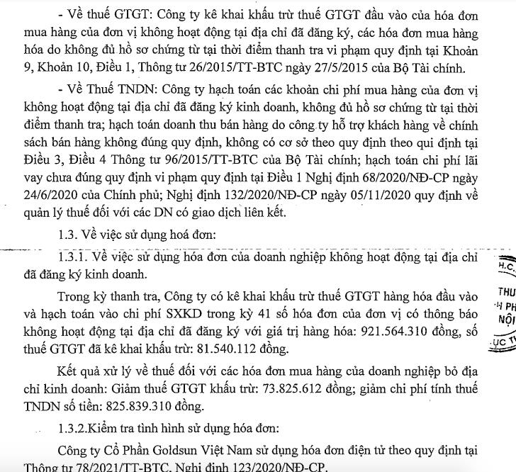 Về việc sử dụng hóa đơn của doanh nghiệp không hoạt động tại địa chỉ đã đăng ký kinh doanh. Trong kỳ thanh tra, Công ty Goldsun có kê khai khấu trừ thuế giá trị gia tăng hàng hóa đầu vào và hạch toán vào chi phí sản xuất kinh doanh trong kỳ 41 số hóa đơn của đơn vị có thông báo không hoạt động tại địa chỉ đã đăng ký với giá trị hàng hóa là hơn 921,5 triệu đồng, số thuế giá trị gia tăng đã kê khai khấu trừ là hơn 81,5 triệu đồng.
