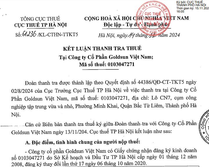 Cục thuế thành phố Hà Nội mới ban hành kết luận thanh tra thuế tại Công ty cổ phần cổ phần Goldsun Việt Nam, có địa chỉ tại Lô CN7, cụm Công nghiệp tập trung vừa và nhỏ, phường Minh Khai, quận Bắc Từ Liêm, Hà Nội.