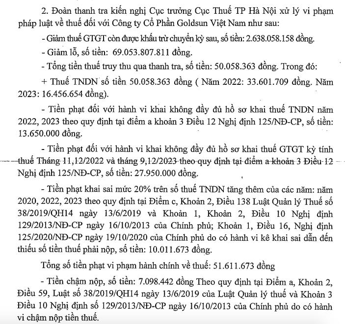 Đoàn thanh tra kiến nghị Cục trưởng Cục Thuế TP Hà Nội xử lý vi phạm pháp luật về thuế đối với Công ty cổ phần Goldsun Việt Nam gồm, giảm thuế giá trị gia tăng còn được khấu trừ chuyển kỳ sau số tiền 2,6 tỷ đồng; giảm lỗ số tiền 69 tỷ đồng.