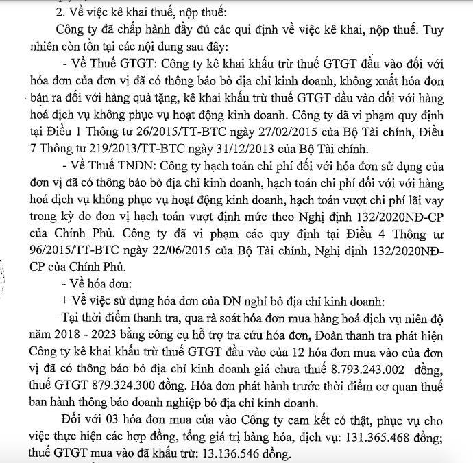 Về việc sử dụng hoá đơn của doanh nghiệp nghỉ bỏ địa chỉ kinh doanh, tại thời điểm thanh tra, qua rà soát hóa đơn mua hàng hóa dịch vụ niên độ năm 2018 - 2023 bằng công cụ hỗ trợ tra cứu hóa đơn, Đoàn thanh tra phát hiện Công ty kê khai khấu trừ thuế GTGT đầu vào của 12 hóa đơn mua vào của đơn vị đã có thông báo bỏ địa chỉ kinh doanh giá chưa thuế hơn 8,79 tỷ đồng, thuế GTGT 879,3 triệu đồng. Hóa đơn phát hành trước thời điểm cơ quan thuế ban hành thông báo doanh nghiệp bỏ địa chỉ kinh doanh.