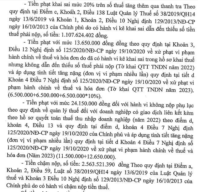 Bên cạnh đó, doanh nghiệp bị phạt 24,1 triệu đồng đối với hành vi không nộp phụ lục theo quy định về quản lý thuế đối với doanh nghiệp có giao dịch liên kết kèm theo hồ sơ quyết toán thuế thu nhập doanh nghiệp (năm 2022).