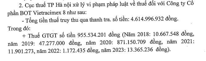Theo đó, công ty phải nộp tổng số tiền thuế truy thu qua thanh tra là hơn 4,61 tỷ đồng. Đồng thời, BOT Vietracimex 8 bị phạt khai sai mức 20% trên số thuế tăng thêm qua thanh tra do có hành vi kê khai sai dẫn đến thiếu số tiền thuế phải nộp là 1,1 tỷ đồng.