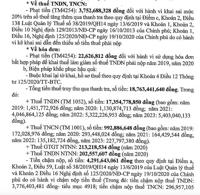 Ngoài ra, công ty phải đóng số tiền chậm nộp là 4,2 tỷ đồng do có hành vi chậm nộp tiền thuế. Số tiền chậm nộp nêu trên tính đến hết ngày 5/12/2024.