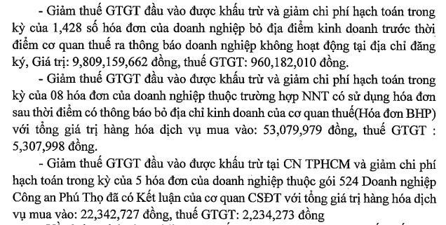 Giảm thuế GTGT đầu vào được khấu trừ và giảm chi phí hạch toán trong kỳ của 1.428 số hóa đơn của doanh nghiệp bỏ địa điểm kinh doanh trước thời điểm cơ quan thuế ra thông báo doanh nghiệp không hoạt động tại địa chỉ đăng ký, giá trị 9,8 tỷ đồng, thuế GTGT là 960,1 triệu đồng.