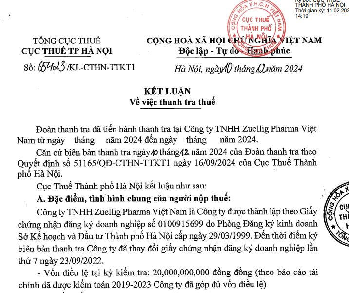 Cục thuế Hà Nội (Tổng Cục thuế) ngày 10/12/2024 đã ban hành kết luận về việc thanh tra thuế tại Công ty TNHH Zuellig Pharma Việt Nam.