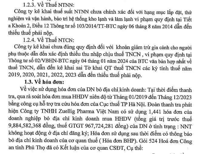Về việc sử dụng hóa đơn của DN bỏ địa chỉ kinh doanh, tại thời điểm thanh tra, qua rà soát hóa đơn mua HHDV niên độ từ tháng 1/2029 đến tháng 12/2023, đoàn thanh tra phát hiện công ty TNHH Zuellig Pharma Việt Nam có sử dụng 1.441 hóa đơn của doanh nghiệp bỏ địa chỉ kinh doanh mua HHDV (tổng giá trị trước thuế là hơn 9,88 tỷ đồng, thuế GTGT 967,7 triệu đồng) của doanh nghiệp ở tình trạng NNT không hoạt động ở địa chỉ đăng ký. Ngoài ra, hoá đơn sử dụng sau thời điểm có thông báo bỏ địa chỉ kinh doanh của cơ quan thuế.