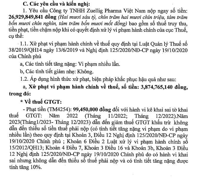 Với những sai phạm trên, Cục thuế Hà Nội yêu cầu Công ty TNHH Zuellig Pharma Việt Nam nộp ngay số tiền hơn 26,92 tỷ đồng bao gồm số thuế truy thu, tiền phạt, tiền chậm nộp khi có quyết định xử lý vi phạm hành chính của cục Thuế.