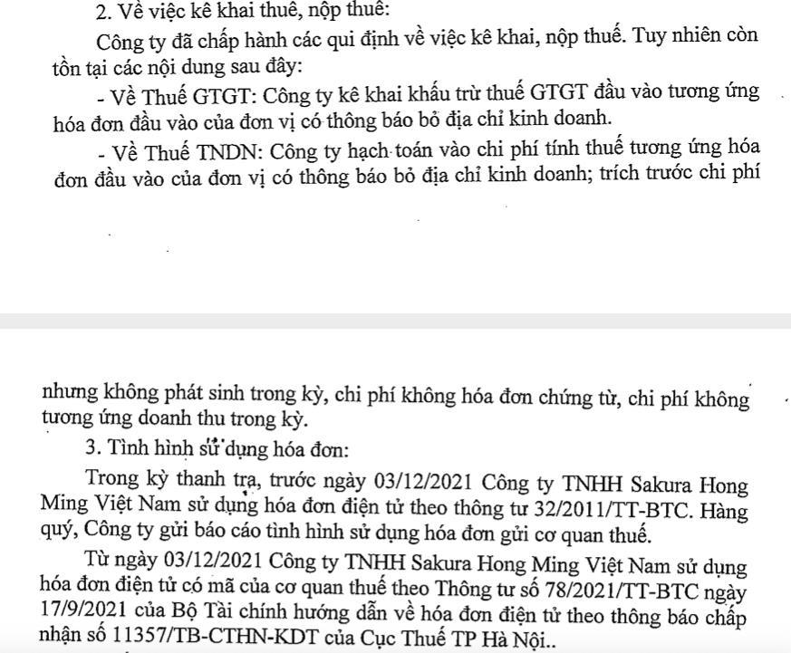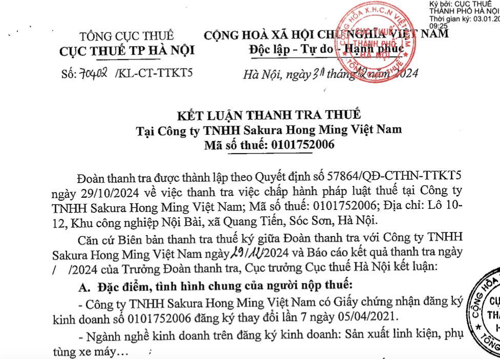 Cục thuế Hà Nội (Tổng cục Thuế) mới đây ban hành kết luận thanh tra tại Công ty TNHH Sakura Hong Ming Việt Nam, có địa chỉ tại lô 10 - 12, Khu công nghiệp Nội Bài, xã Quang Tiến, Sóc Sơn, Hà Nội.