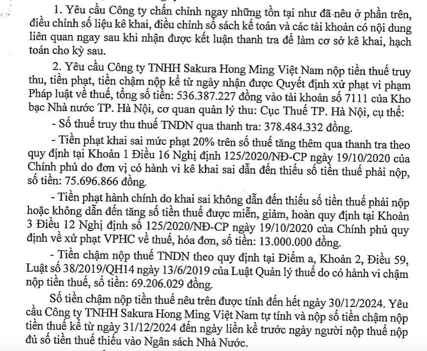 Công ty TNHH Sakura Hong Ming Việt Nam phải nộp tiền thuế truy thu, tiền phạt, tiền chậm nộp kể từ ngày nhận được quyết định xử phạt là hơn 536,3 triệu đồng. Trong đó, số tiền truy thu thuế TNDN qua thanh tra là hơn 378,48 triệu đồng. Tiền phạt do đơn vị có hành vi kê khai sai dẫn đến thiếu số tiền thuế phải nộp là 75,69 triệu đồng. Tiền phạt hành chính do khai sai không dẫn đến thiếu số tiền thuế phải nộp hoặc không dẫn đến tăng số tiền thuế được miễn, giảm hoàn là 13 triệu đồng.