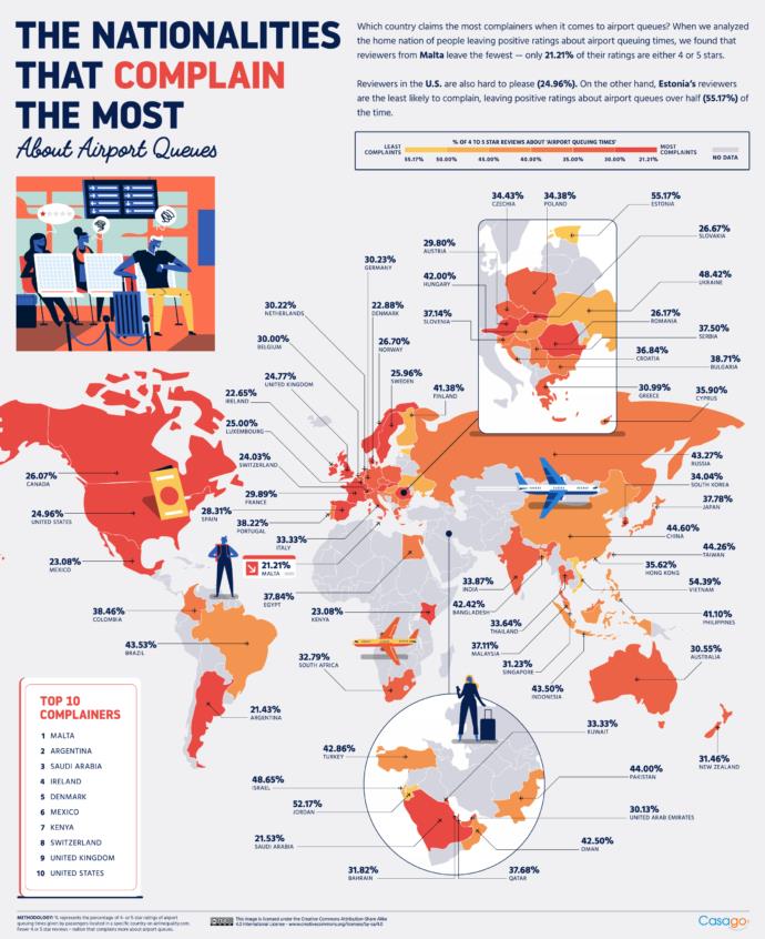 Mặc dù việc xếp hàng ở một mức độ nhất định là không thể tránh khỏi, đặc biệt là trong mùa du lịch cao điểm, tuy nhiên một số sân bay, khách hàng phải xếp thời gian dài hơn những sân bay khác.
