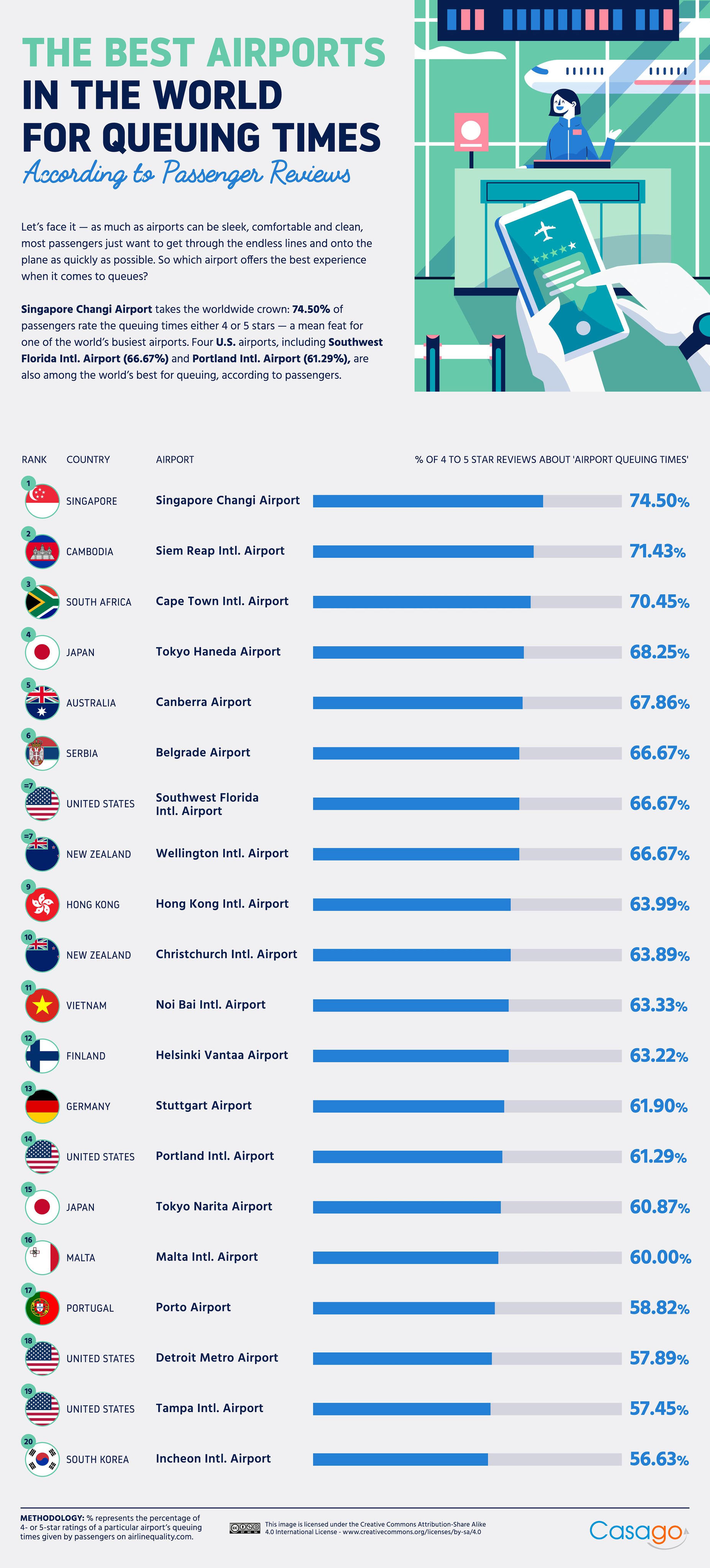 Kết quả cho thấy sân bay Changi ở Singapore xếp đầu tiên với 74,5% hành khách đánh giá thời gian xếp hàng là 4 hoặc 5 sao. Changi cũng là sân bay được Skytrax - tổ chức đánh giá và xếp hạng sân bay, hãng hàng không có trụ sở tại London - bình chọn là sân bay hàng đầu thế giới năm 2023.