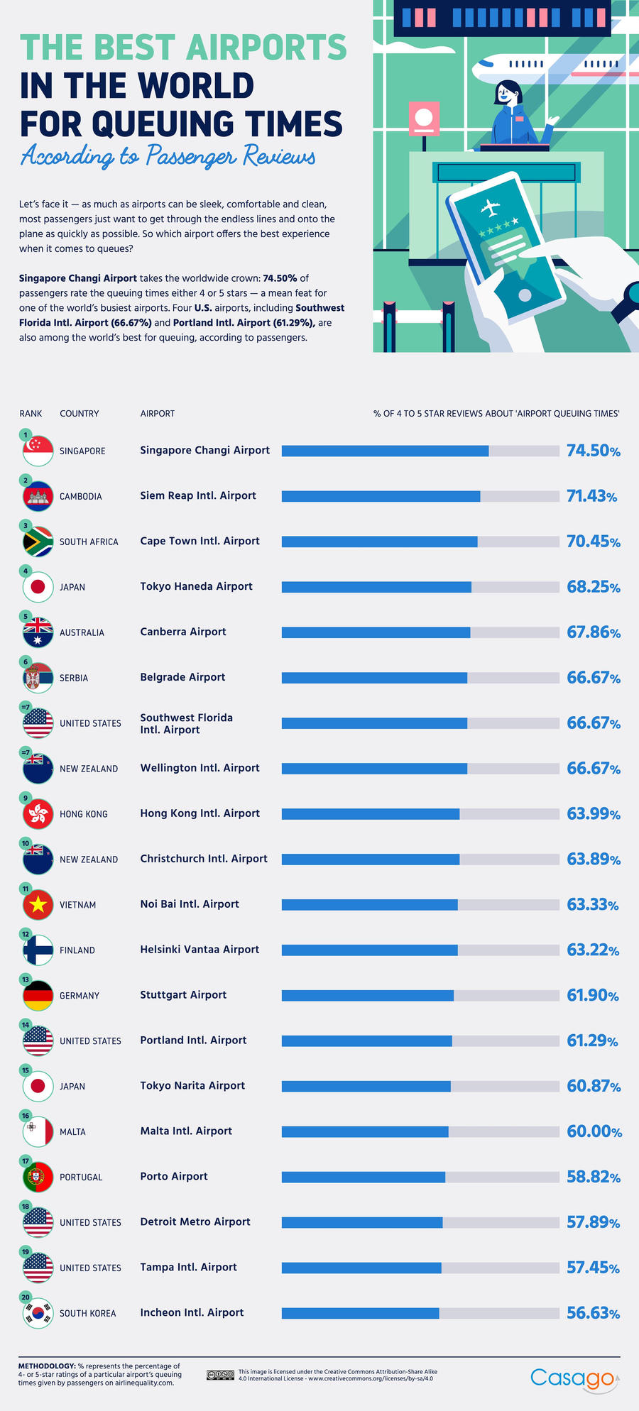 Đáng chú ý, trong danh sách này, sân bay Nội Bài ở Hà Nội đứng thứ 11 trong bảng xếp hạng với 63,33% đánh giá 4 và 5 sao về thời gian xếp hàng. Sân bay Tân Sơn Nhất không có tên trong bảng xếp hạng top 20 của Casago.