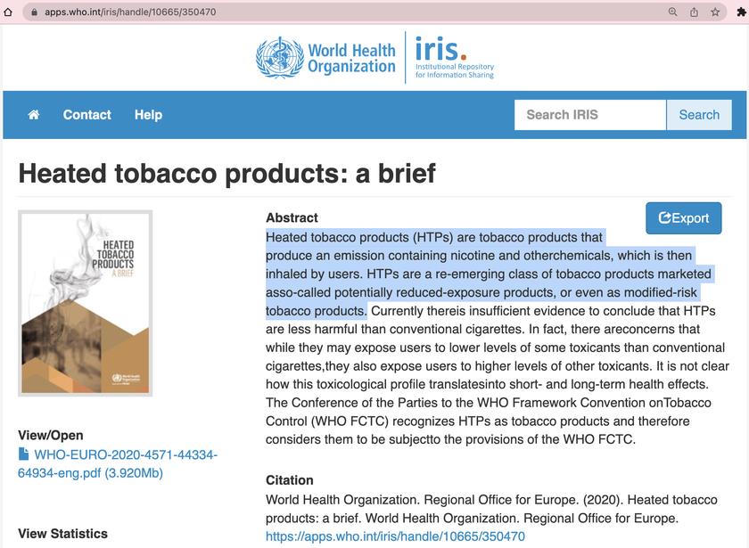 Tổ chức Y tế Thế giới (WHO) đã xác nhận rằng hàm lượng các chất gây hại từ thuốc lá làm nóng thải ra thấp hơn so với thuốc lá điếu. Tuy nhiên, việc giảm phơi nhiễm với các chất độc hại không đồng nghĩa rằng sản phẩm này giảm tác hại.