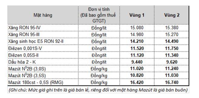 Dầu hỏa giảm 144 đồng/lít, bán không cao hơn 9.449 đồng/lít; giá dầu diesel bán 11.128 đồng/lít, hạ 390 đồng và dầu mazut bán tối đa 10.826 đồng/kg, thấp hơn 117 đồng so với kỳ điều hành trước.