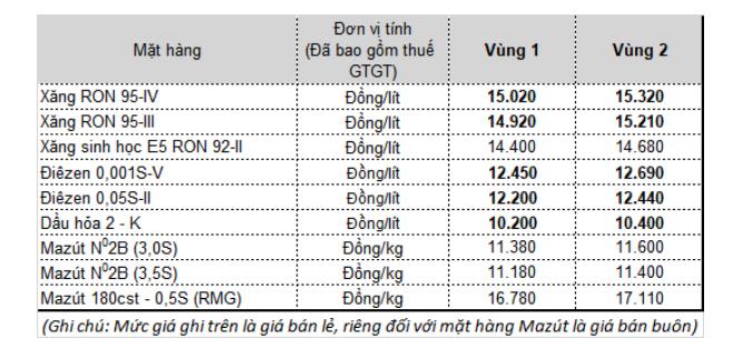 Mức chi Quỹ bình ổn của xăng E5 RON92 là 932 đồng/ lít, tăng 32 đồng. Xăng RON 95 giữ nguyên mức chi là 479 đồng/lít. Dầu hỏa và dầu mazut mức chi lần lượt là 100 và 300 đồng/kg. Riêng dầu diesel không chi bình ổn quỹ.