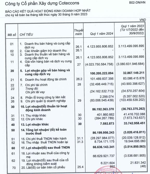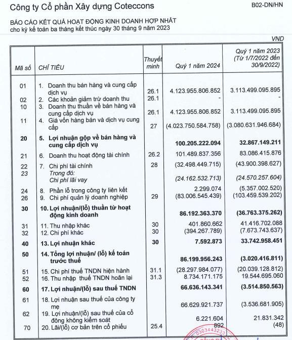 Doanh thu hoạt động tài chính đạt 101,4 tỷ đồng, tăng 22,1% so với cùng kỳ. Khấu trừ chi phí, giá vốn, Coteccons ghi nhận lợi nhuận sau thuế đạt 66,6 tỷ đồng.
