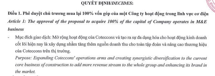 Mục đích giao dịch này là nhằm mở rộng hoạt động của Coteccons và tạo ra sự đa dạng hoá cho hoạt động kinh doanh cốt lõi hiện nay. Tuy nhiên, doanh nghiệp không công bố chi tiết tên công ty dự kiến mua lại và giá trị thương vụ.