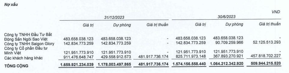 Tuy giảm các khoản phải thu khó đòi, doanh nghiệp này vẫn còn 1.659 tỷ đồng tiền nợ xấu. Trong đó, 45% (tương đương 483,6 tỷ đồng) đến từ Công ty Ngôi Sao Việt - thuộc Tân Hoàng Minh từng bỏ cọc đấu giá đất Thủ Thiêm; Công ty Saigon Glory - chủ đầu tư dự án The Spirit of Saigon và Công ty Đầu tư Minh Việt - chủ đầu tư dự án Tricon Towers cũng 'góp phần' trong tổng nợ xấu lần lượt là 142,8 tỷ đồng và 121,9 tỷ đồng. CTD đã trích lập dự phòng toàn bộ khoản nợ của ba chủ đầu tư trên.