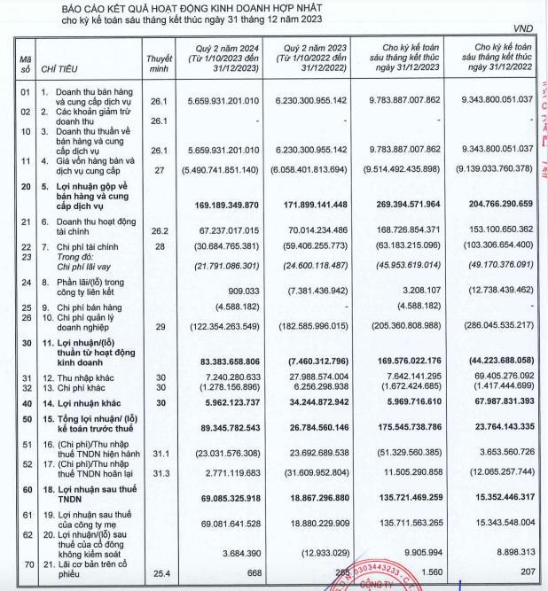 Trong năm tài chính 2024, CTD đặt kế hoạch doanh thu hợp nhất 17.793 tỷ đồng và lãi sau thuế 274 tỷ đồng. So với kế hoạch cả năm, Coteccons thực hiện được 55% chỉ tiêu doanh thu thuần và 50% chỉ tiêu lãi sau thuế sau quý II niên độ tài chính 2024.