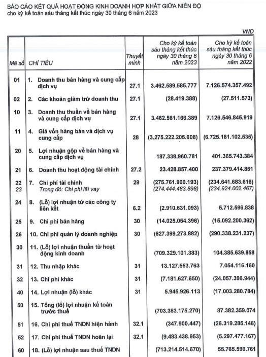 Theo báo cáo tài chính soát xét bán niên 2023, HBC ghi nhận khoản lỗ sau thuế 713,2 tỷ đồng, giảm 815 tỷ so với mức lãi gần 102 tỷ đồng ghi nhận tại báo cáo tự lập.