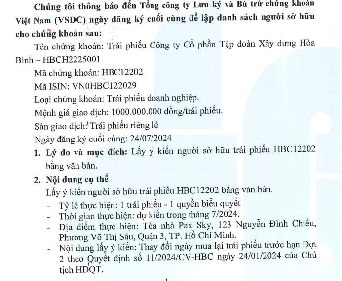 Vào ngày 24/7 tới đây, Công ty cổ phần Tập đoàn Xây dựng Hoà Bình (mã ck: HBC) sẽ chốt danh sách trái chủ sở hữu trái phiếu mã HBCH2225001 để lấy ý kiến trái chủ bằng văn bản, thời gian lấy ý kiến dự kiến trong tháng 7/2024.