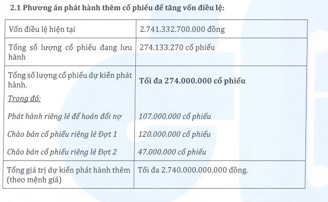 Ở phương án 2, công ty dự kiến chào bán cổ phiếu riêng lẻ đợt 1 với tối đa 120 triệu cổ phiếu, giá chào bán 12.000 đồng/cổ phiếu. Đối tượng chào bán là các nhà đầu tư chiến lược và/hoặc các nhà đầu tư chứng khoán chuyên nghiệp.