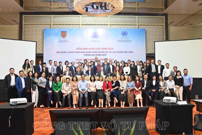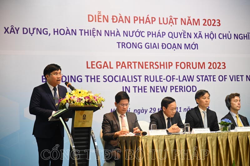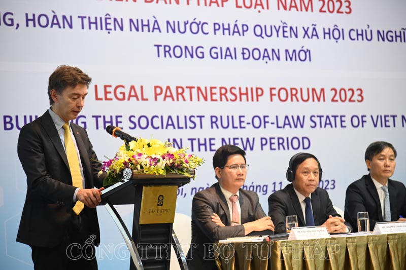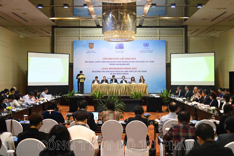 Ngày 29/11, Bộ Tư pháp phối hợp với Đại sứ Liên minh châu Âu tại Việt Nam và Chương trình phát triển Liên hợp quốc tại Việt Nam tổ chức Diễn đàn pháp luật năm 2023 với chủ đề: “Xây dựng, hoàn thiện Nhà nước pháp quyền xã hội chủ nghĩa Việt Nam trong giai đoạn mới”. Thứ trưởng Bộ Tư pháp Nguyễn Khánh Ngọc, Phó Trưởng Ban Nội chính Trung ương Nguyễn Thanh Hải, Vụ trưởng Vụ Hợp tác quốc tế, Bộ Tư pháp Nguyễn Hữu Huyên, Đại sứ Phái đoàn Liên minh châu Âu tại Việt Nam Julien Guerrier, Điều phối viên thường trú Liên hợp quốc tại Việt Nam Pauline Tamesis đồng chủ trì Diễn đàn.
