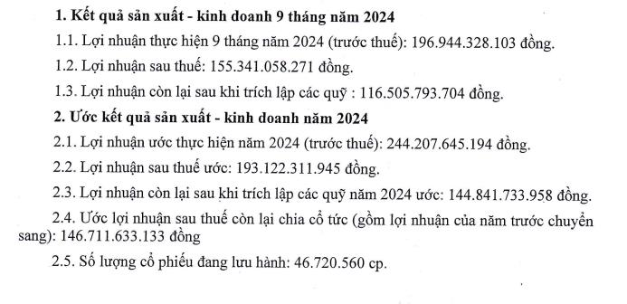 Sau khi trích quỹ, lãi sau thuế còn lại chia cổ tức (gồm lợi nhuận năm trước chuyển sang) là 146,7 tỷ đồng.