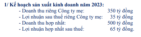 Trong năm 2023, HUB đặt kế hoạch kinh doanh với doanh thu 500 tỷ đồng, tăng 17,6% so với cùng kỳ. Dự kiến lợi nhuận sau thuế đạt 65 tỷ đồng, giảm nhẹ 2,7% so với cùng kỳ năm trước.