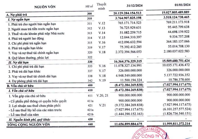 Vốn chủ sở hữu tính đến thời điểm cuối năm 2024 là âm 8.472 tỷ đồng, tăng so với con số 7.027 tỷ đồng năm 2023. Lỗ sau thuế chưa phân phối là hơn 9.372 tỷ đồng.
