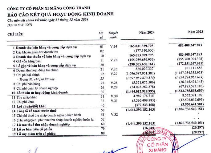 Về bức tranh tài chính, theo báo cáo kinh doanh năm 2024 đã kiểm toán của công ty Xi măng Công Thanh, doanh nghiệp ghi nhận doanh thu thuần đạt 165,6 tỷ đồng, giảm 65,7% so với năm 2023.