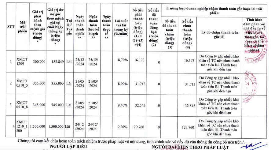 Theo đó, trong năm 2024, Xi măng Công Thanh đã chậm thanh toán gần 210,2 tỷ đồng tiền lãi cho 4 lô trái phiếu, bao gồm gần 16,2 tỷ đồng tiền lãi của lô trái phiếu mã XMCT1209; hơn 31,7 tỷ đồng lãi của trái phiếu mã XMCT0510_5; hơn 32,5 tỷ đồng lãi của trái phiếu mã XMCT0510_8 và gần 129,8 tỷ đồng lãi của lô trái phiếu mã XMCT1210_1500.