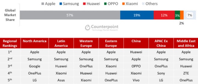 Counterpoint trước đó đã báo cáo việc Xiaomi lần đầu tiên lọt vào top 5 các thương hiệu cao cấp trong quý 1/2020 kể từ năm 2018. Nhưng dù đứng vị trí số 5, thị phần của hãng chỉ chiếm 2% của phân khúc.