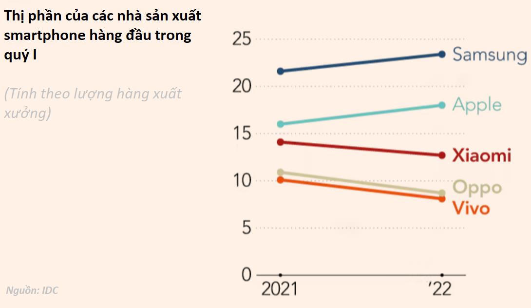 Cũng theo Nikkei Asia, dự báo sản lượng của các nhà sản xuất điện thoại thông minh ít tiếp xúc với thị trường Trung Quốc, chẳng hạn như Samsung Electronics, không thay đổi nhiều dù họ gặp thách thức từ lạm phát và tình hình căng thẳng địa chính trị toàn cầu. Gã khổng lồ công nghệ Hàn Quốc hy vọng sẽ xuất xưởng hơn 270 triệu đơn vị trong năm nay, tăng nhẹ so với năm ngoái.