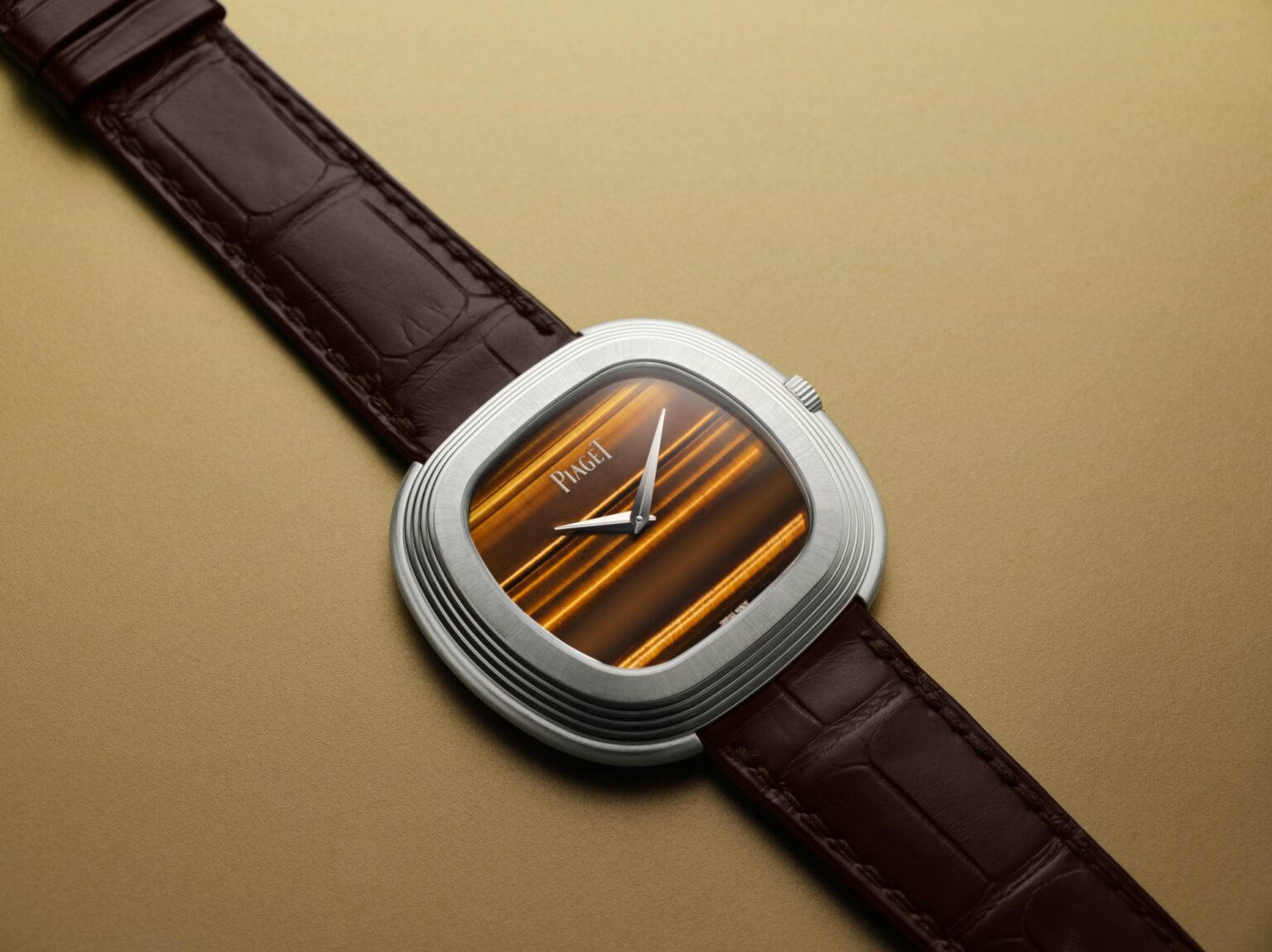 Một biến thể khác rất đáng chú ý của đồng hồ tối giản mà không hề nhàm chán chính là chiếc Piaget Andy Warhol. Chính thức được mang tên của người nghệ sĩ hào hoa, chiếc đồng hồ có cấu hình “time-only” chỉ với hai kim chỉ thị giờ và phút, biến mặt số thành một tấm toan phóng khoáng để nhà chế tác phô diễn cá tính nghệ thuật của mình với các loại vân đá khác nhau. Trong hình là phiên bản với bộ vỏ bằng vàng trắng hình gối với các rãnh trang trí đặc trưng, đi kèm với mặt số bằng đá mắt hổ và bộ máy lên cót tự động 501P1.
