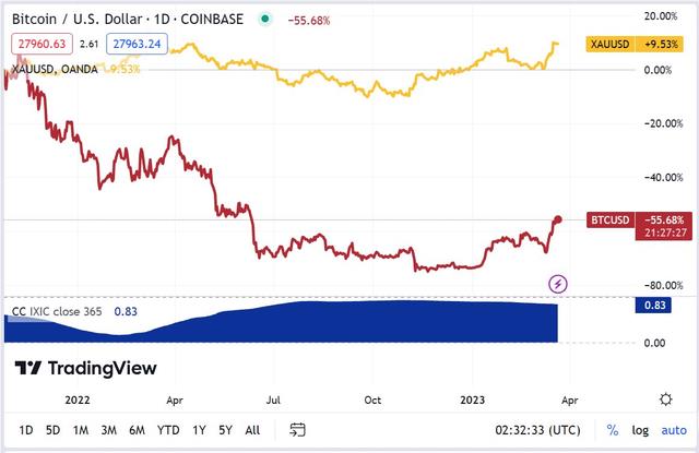 Các số liệu từ Tradingview mới đây cho thấy, trong một năm vừa qua, tương quan giữa đồng tiền ảo Bitcoin và chỉ số Nasdaq Composite (mã IXIC) đang ở mức 0,83. Theo đơn vị này giải thích, chỉ số tương quan là một công cụ thống kê để so sánh biến động của các loại tài sản. Khi tương quan càng tiến gần về 1, đồng nghĩa với việc hai loại tài sản sẽ có biến động giống nhau. Thông thường, khi chỉ số này trong từ 0,8 đến 1 là mức có tương quan cao. Điều này cũng đồng nghĩa với việc Bitcoin đang biến động giống với một loại tài sản rủi ro hơn là một kênh phòng thủ.