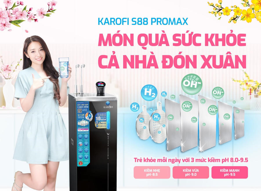Được biết, Hydro-ion kiềm là dòng máy lọc nước mới nhất của Karofi với S-Series gồm 3 model: KAE-S68, KAE-S86, KAE-S88 PROMAX. Trong đó, máy lọc nước nóng lạnh Hydro-ion kiềm KAE-S88 PROMAX là sản phẩm cao cấp nhất, hội tụ nhiều công nghệ đỉnh cao giúp chăm sóc sức khỏe toàn diện cho cả gia đình - xứng đáng là món quà tặng sức khỏe dành cho người thân dịp Tết 2025.
