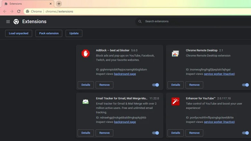 - Để tắt một tiện ích mở rộng, hãy tắt công tắc bật/tắt của nó. Nếu không chắc nên tắt tiện ích nào, bạn có thể xem Trình quản lý tác vụ để xem tiện ích mở rộng nào ngốn nhiều RAM nhất.