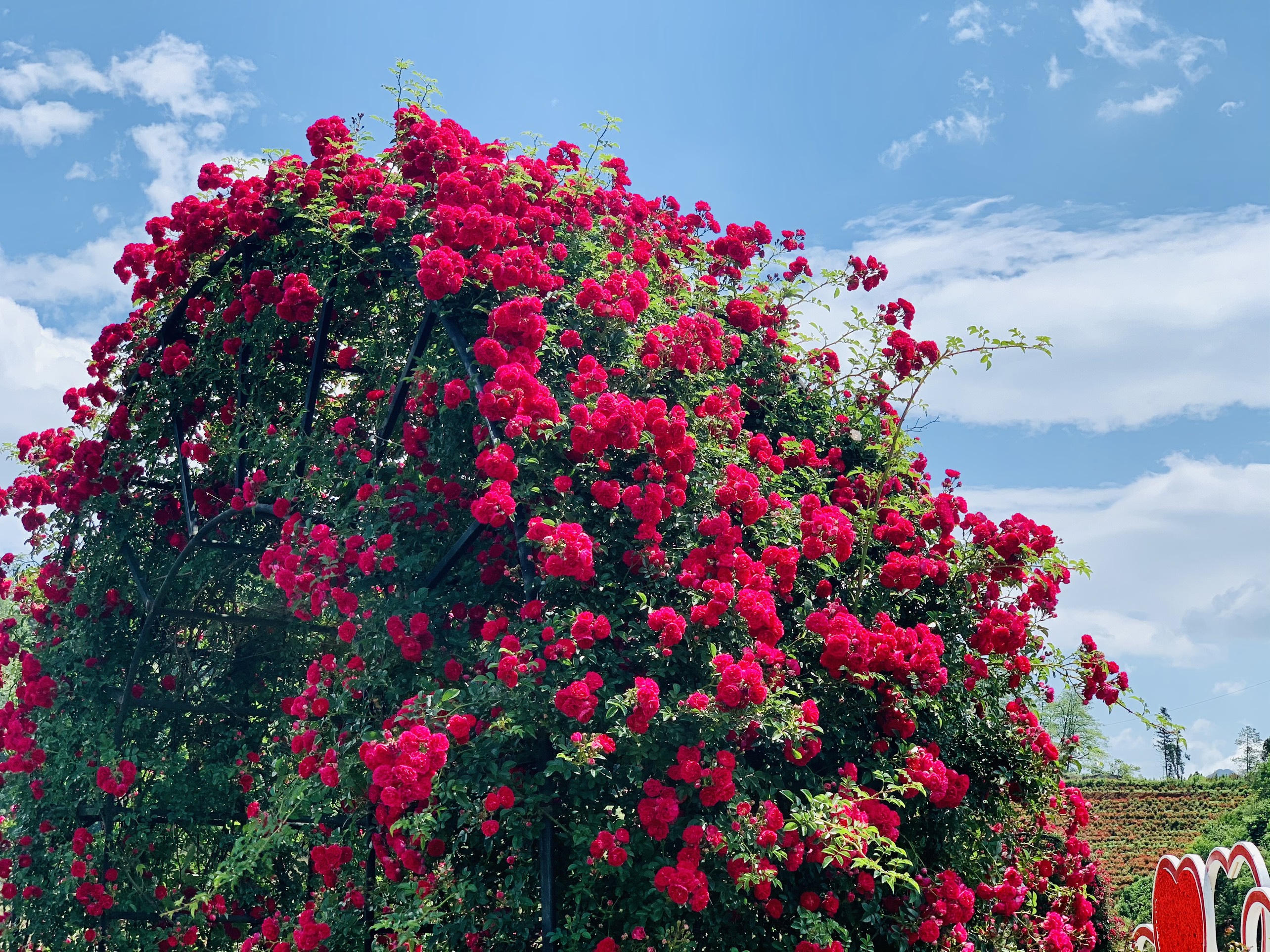 Bước ra khỏi Ga đến tàu hỏa leo núi, tới khuôn viên bên ngoài Ga đi cáp treo Fansipan, cả một trời hoa hồng ngợp ngời mở ra. Hồng leo Sa Pa đỏ thắm, khoác lên những đại cảnh hình trái tim, hình vòm, nổi bật trên thung lũng. Đi dưới những vòm hồng leo ấy chẳng khác nào lạc giữa thiên đường hạ giới. Theo đại diện của khu du lịch, hoa hồng leo Sa Pa năm nay nở sớm và rực rỡ hơn mọi năm, đạt độ “chín” nhất vào đúng dịp nghỉ lễ 30/4 & 1/5.