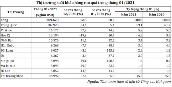 Theo số liệu của Tổng cục Thống kê, xuất khẩu mặt hàng rau quả của Việt Nam trong tháng 1/2021 đã tăng trưởng trở lại, sau khi giảm liên tiếp kể từ tháng 9/2020. Thị trường xuất khẩu hàng rau quả của Việt Nam cũng đã có sự dịch chuyển rõ nét trong tháng 1/2021, giảm dần sự phụ thuộc vào thị trường Trung Quốc.