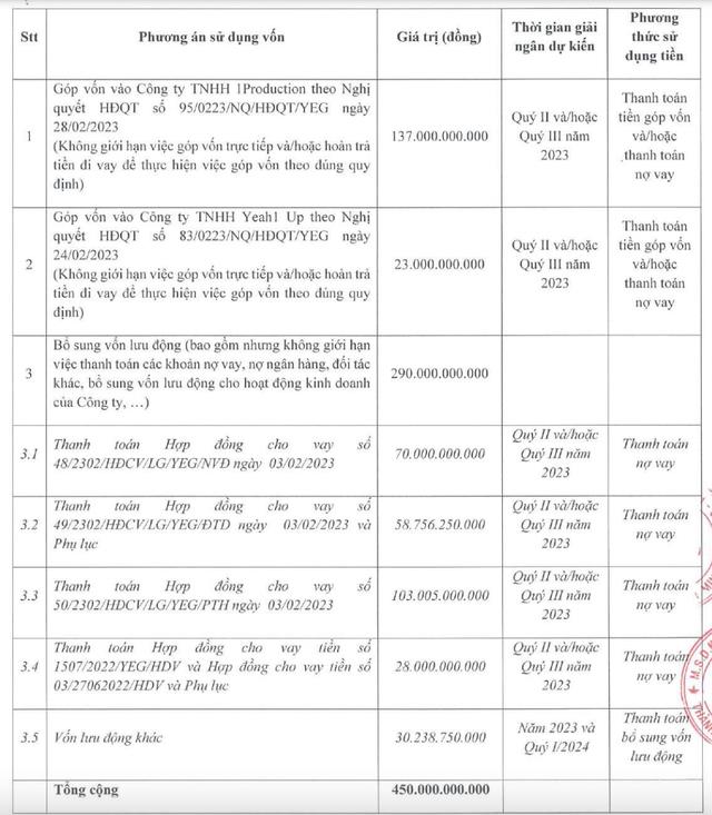 Công ty YEG dự kiến dùng 23 tỷ đồng thanh toán tiền góp vốn và/hoặc thanh toán nợ vay Công ty TNHH Yeah1 Up; và 290 tỷ đồng bổ sung vốn lưu động.