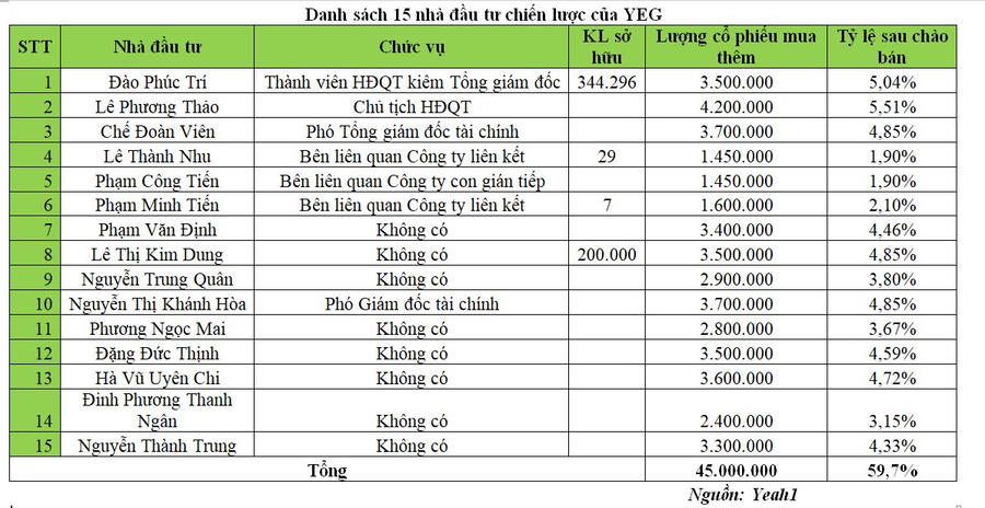 Số lượng nhà đầu tư dự kiến là 15 nhà đầu tư. Đáng chú ý, ông Đào Phúc Trí, Thành viên Hội đồng quản trị kiêm Tổng giám đốc dự kiến mua 3,5 triệu cổ phiếu YEG để nâng sở hữu lên 5,04% vốn điều lệ và trở thành cổ đông lớn sau đợt chào bán.