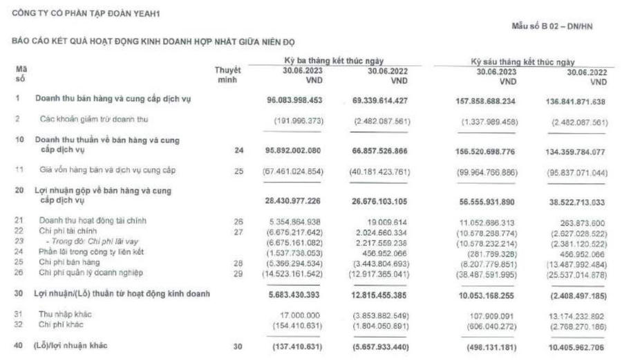 Theo báo cáo tài chính hợp nhất giữa niên độ quý II/2023, Yeah1 ghi nhận doanh thu thuần đạt 95,8 tỷ đồng, tăng 43,7% so với quý II/2022.